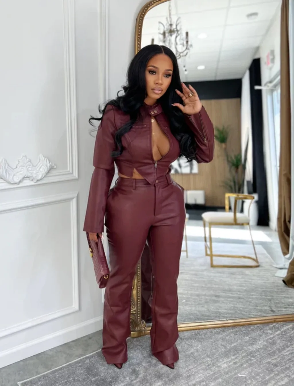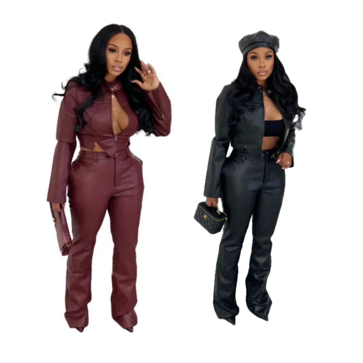 C2054 Available Wholesale Hot Selling Casual PU Leather Jackets and Pants Stretch Sets